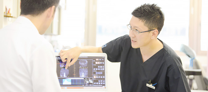 そのため、患者様にご協力して頂くためには「歯周病に対する理解」と「口腔内の現状理解」が必要です。そこで当院では様々な「情報提供ツール」を活用し、患者様に納得して頂けるまで説明を行います。例えば、レントゲン画像で骨の状態の報告、デジタルツールを活用した視覚的にも分かりやすい説明、術前術後の状態を写真でお見せする等の取り組みを行っています。